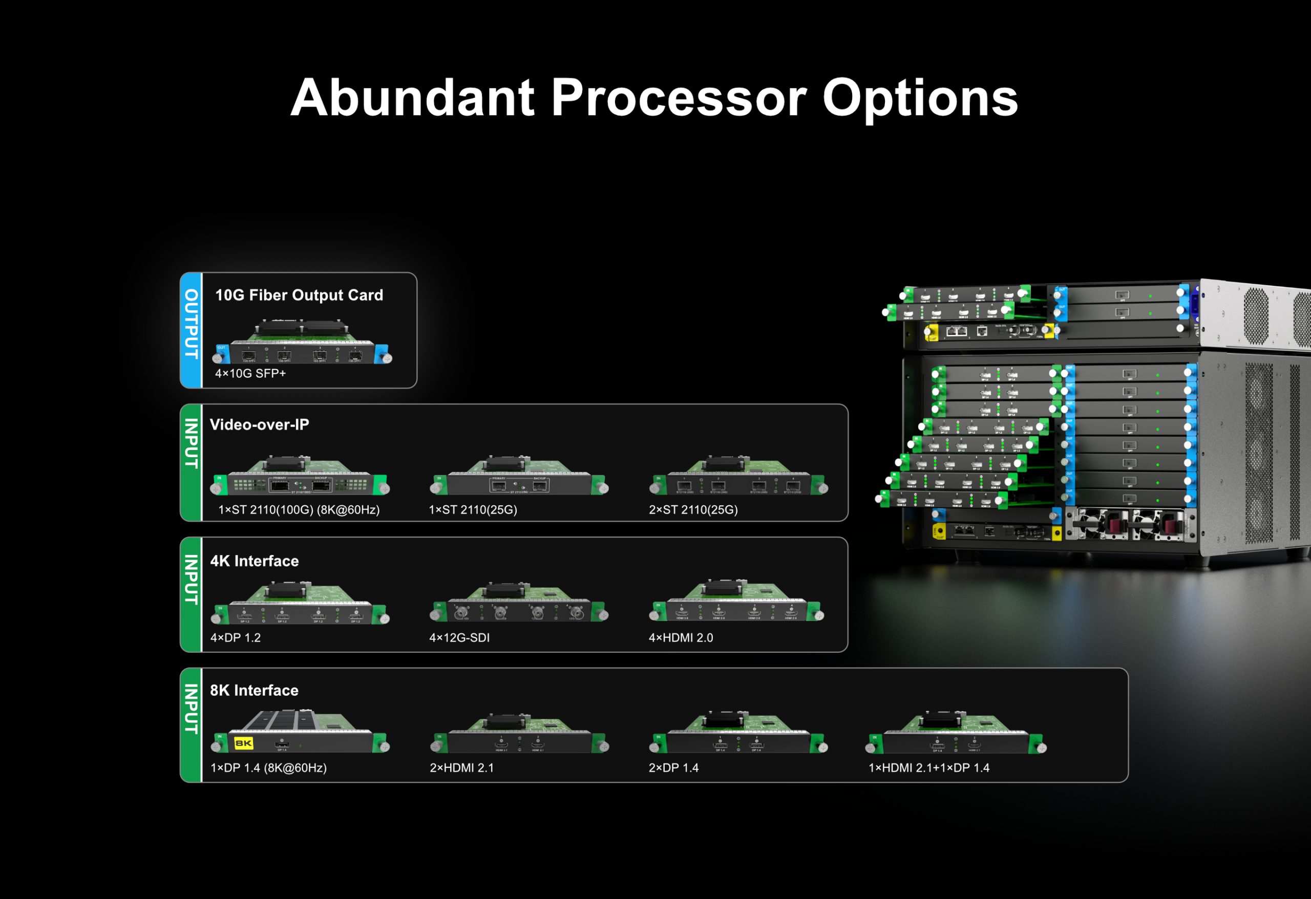 | Input Interface | Input Card Options Video-over-IP 8K Level 4K Level | 3×HDMI 2.0 1×DP 1.2 1×12G-SDI | 1×HDMI 2.0 1×HDMI 1.4 1×DP 1.1 2×3G-SDI | 2×HDMI 1.3 1×3G-SDI | 1×HDMI 1.3 (IN+LOOP) | |